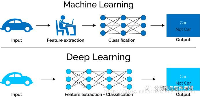 深度学习中最令人激动的特性之一是它在特征学习上的表现。该算法在从原始数据中检测特征方面表现地特别好。有一个很好的例子,就是通过深度学习技术来识别汽车图片中的车轮。下图说明了典型机器学习与深度学习之间的区别: