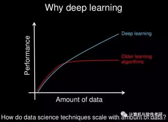 这是机器学习的一个子领域,近年来表现出了很大的潜力。它涉及到大脑中神经元结构和功能的算法。Andrew Ng 曾用下图对比说明传统机器学习算法和深度学习算法的特点。从图中可以看出,随着数据的增多,到达一定量后,深度学习算法的表现会明显优于传统的机器学习算法。