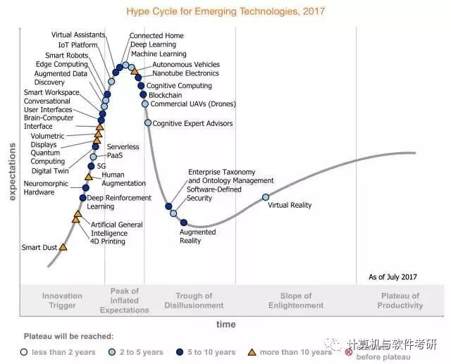 技术的发展往往遵循一个可预期的模式,即先是萌芽,然后炒作,而后幻灭,接着才是技术成熟后的稳步爬升,最后到达应用高峰。研究分析机构 Gartner 每年都会推出这样一个分析新兴技术发展趋势的技术炒作周期报告。前段时间,Gartner 发布了 2017 年的新兴技术炒作周期报告,报告聚焦了前端、后端与平台发展的三大趋势,提出了 AI 将无所不在(人工智能),体验将透明化和沉浸式(AR、VR),以及平台全面数字化(区块链)的观点,建议企业架构师和对技术创新有追求的人员应该积极探索和关注这三大趋势,从而了解掌握这三大趋势对自己公司和自己职业发展的未来影响。简单来说这三大趋势分别对应于括号中我备注的大家平时耳熟能详的词语。从曲线图可以看出,物联网、虚拟助手、深度学习、机器学习、无人车、纳米电子、认知计算以及区块链正处在炒作的高峰。实际上 AR、VR 属于计算机视觉,也可以归于人工智能范畴,因此总体上来说,未来人工智能将无处不在。