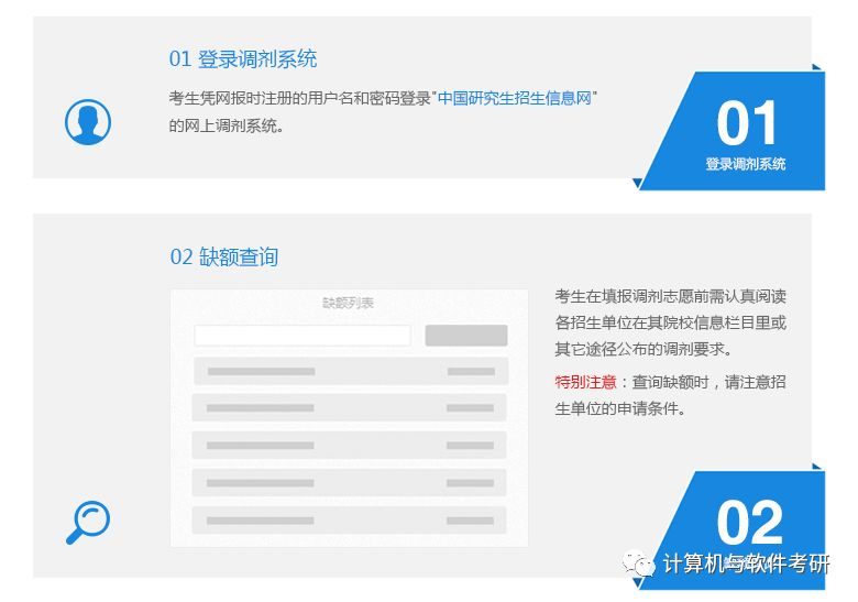 考生需认真阅读各招生单位在其院校信息栏目里或其它途径公布的调剂要求,登录调剂系统后可查询各招生单位的专业缺额信息,特别要留意招生单位的申请条件。