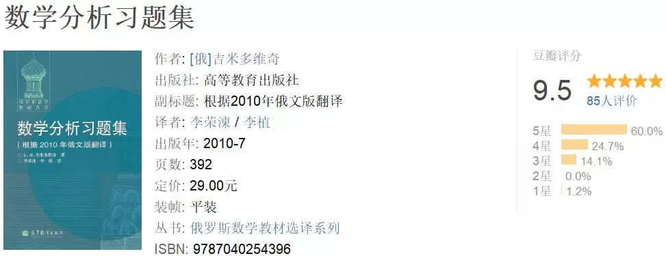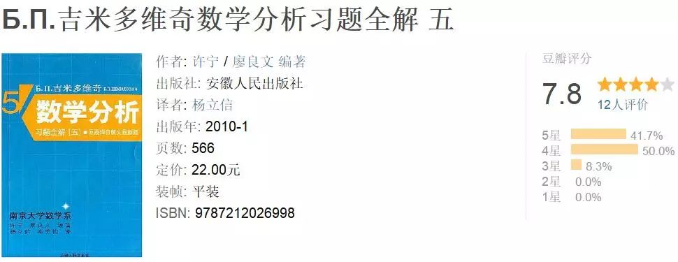 吉米多维奇著的《数学分析习题集》是一本国际知名的著作,它在中国有很大影响,早在上世纪五十年代,国内就出版了该书的中译本。该习题集有五千道习题,数量多,内容丰富,包括了数学分析的全部主题。部分习题难度较大,初学者不易解答。