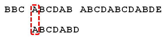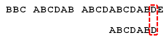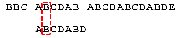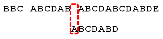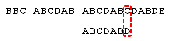 我们要在字符串"BBC ABCDAB ABCDABCDABDE"的中判断是否包含字符串"ABCDABD"。我们将ABCDABD称之为搜索词。