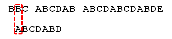 1:首先,字符串"BBC ABCDAB ABCDABCDABDE"的第一个字符与搜索词"ABCDABD"的第一个字符,进行比较。因为B与A不匹配,所以搜索词后移一位。