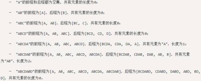 "部分匹配值"就是"前缀"和"后缀"的最长的共有元素的长度。以"ABCDABD"为例,