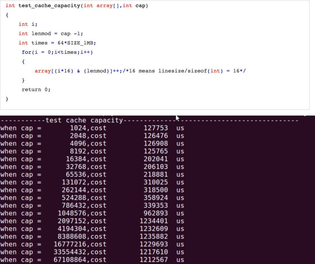 下面的测试代码,执行的次数是一样的,都是64M次但是array的大小不一样。我们分别传入参数为1K,2K ,4K ,8K.....64MB 。在执行之前我们先分析下。