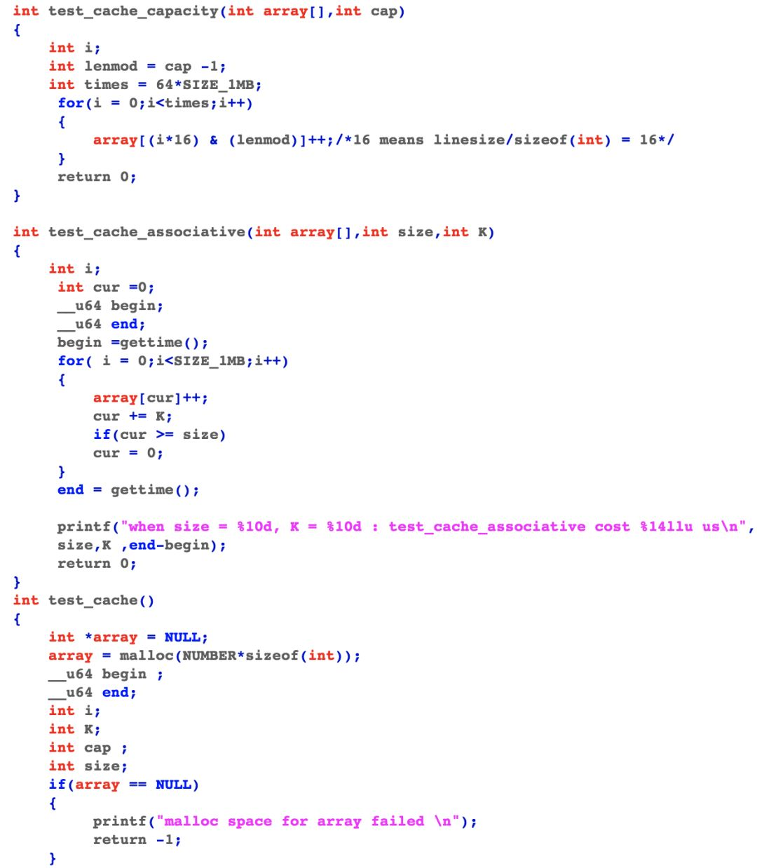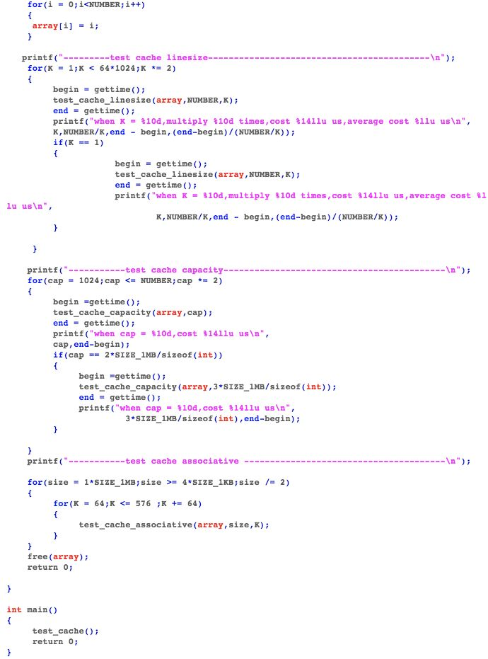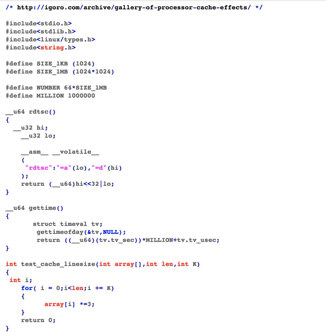 代码看起来有点长,但是分成了3段。先看第一个测试,测试cache的linesize。