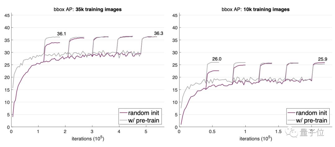当他们把训练图像数量缩减到整个COCO数据集的1/3(35000张图)、甚至1/10(10000张图)时,经过多次迭代,随机初始化看起来还略优于预训练法的效果。