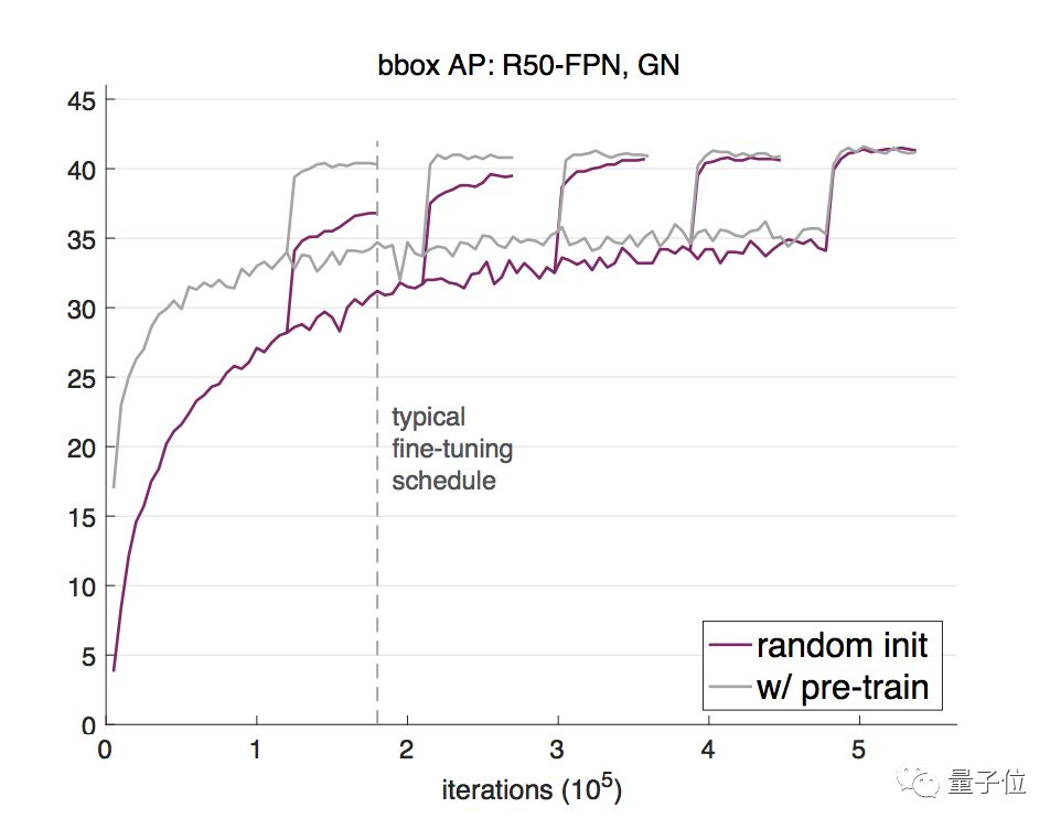 随后,用相应的验证集评估随机权重初始化(紫色线)和用ImageNet预训练后再微调(灰色线)两种方法的边界框平均检测率(AP)。