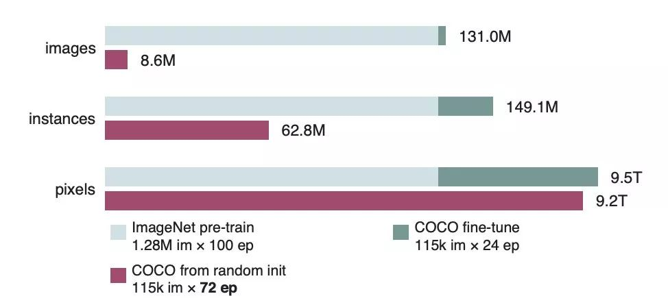 上图就是这两种方法的对比。假设微调的模型已经预训练了100个周期,那么,从零开始训练的模型要迭代的周期数是微调模型的3倍,见到的像素数量才能差不多,实例级、图片级的样本数量依然差距很大。