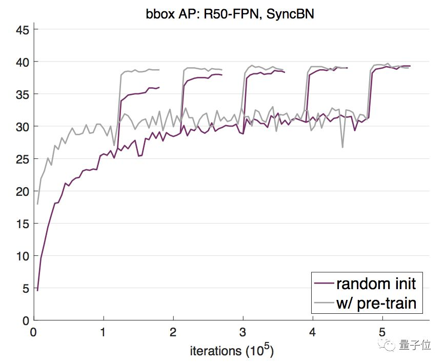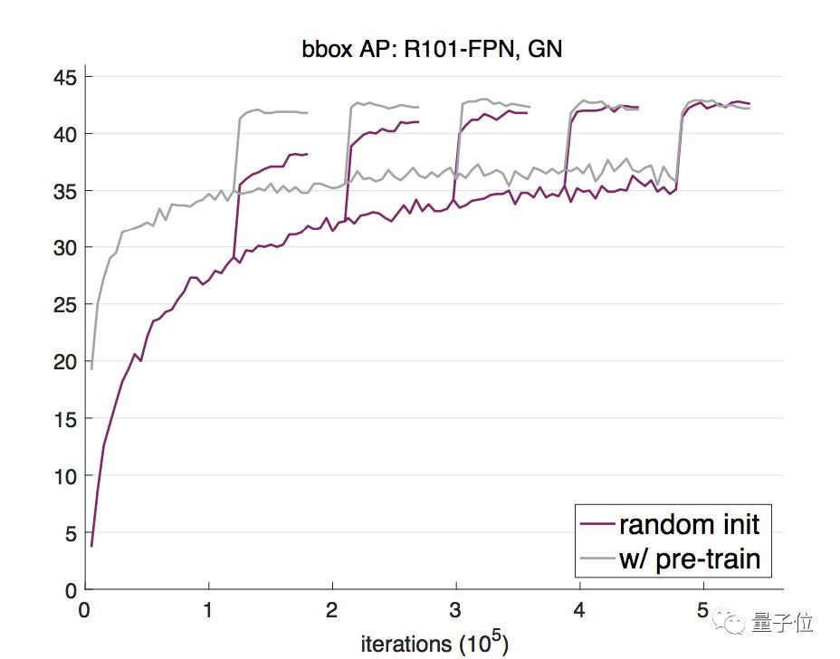 结果显示,随机初始化方法训练出来的模型需要更多迭代才能收敛,但最终收敛效果不比预训练再微调的模型差。