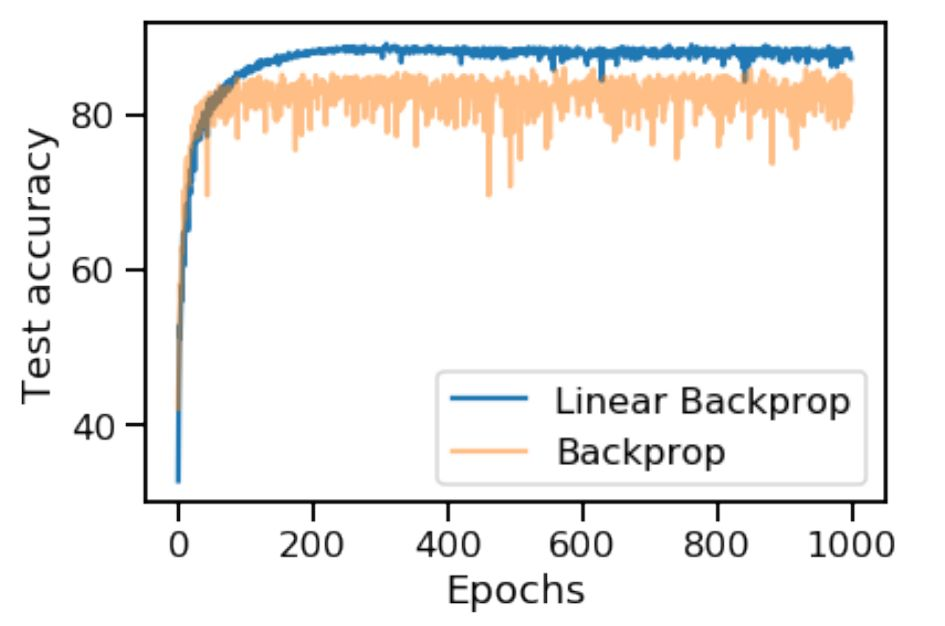 本论文仅研究误差项的线性反向传播,即忽略非线性梯度流带来的单元饱和。本文将这一学习规则称为线性反向传播(Linear Backprop)。因为不用计算梯度,除了确保持续的梯度流以外,Linear Backprop 在计算成本高昂的情况下仍然可以使用。该研究的早期结果表明,使用 Linear Backprop 进行学习与使用 Backprop 不相上下,且能够节约梯度计算的成本。