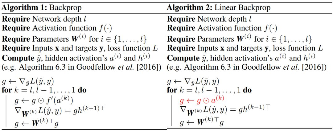 梯度流是学习的必要因素,因此本论文主要研究学习算法都是在确保更优的线性梯度流。线性反向传播算法(见 Algorithm 2)可以确保所有区域的梯度流都能正常传递,因此可用作替代学习算法。与反向传播(见 Algorithm 1)相比,线性反向传播中的前向传播过程是相同的。该网络架构具备非线性激活函数,因此仍然是高度非线性的,但我们在计算损失函数时只考虑线性反向传播误差。由于在线性反向传播中,激活函数的导数不用计算(Algorithm 2 中红色字),因此线性反向传播与反向传播相比节约了计算量 O(ml)。