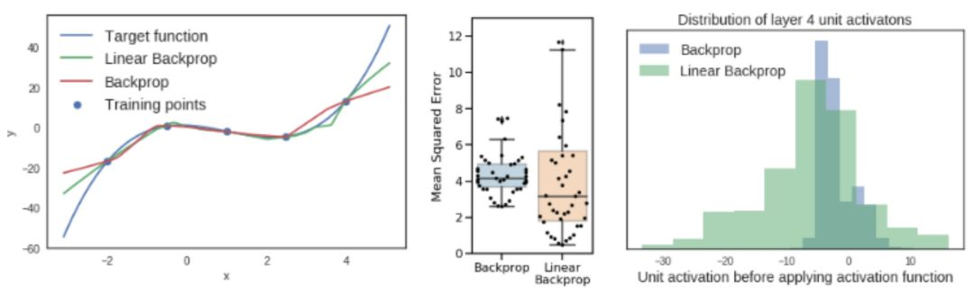 图 1:(左)相同的 MLP 架构使用反向传播和线性反向传播时在 5 个样本上的过拟合情况。(中)MLP 使用 50 种不同的权重随机初始化在相同的 5 个点上预测和目标之间的 MSE。(右)使用 sigmoid 激活函数进行训练后,单元激活值的直方图。