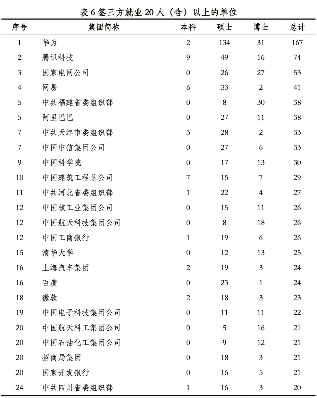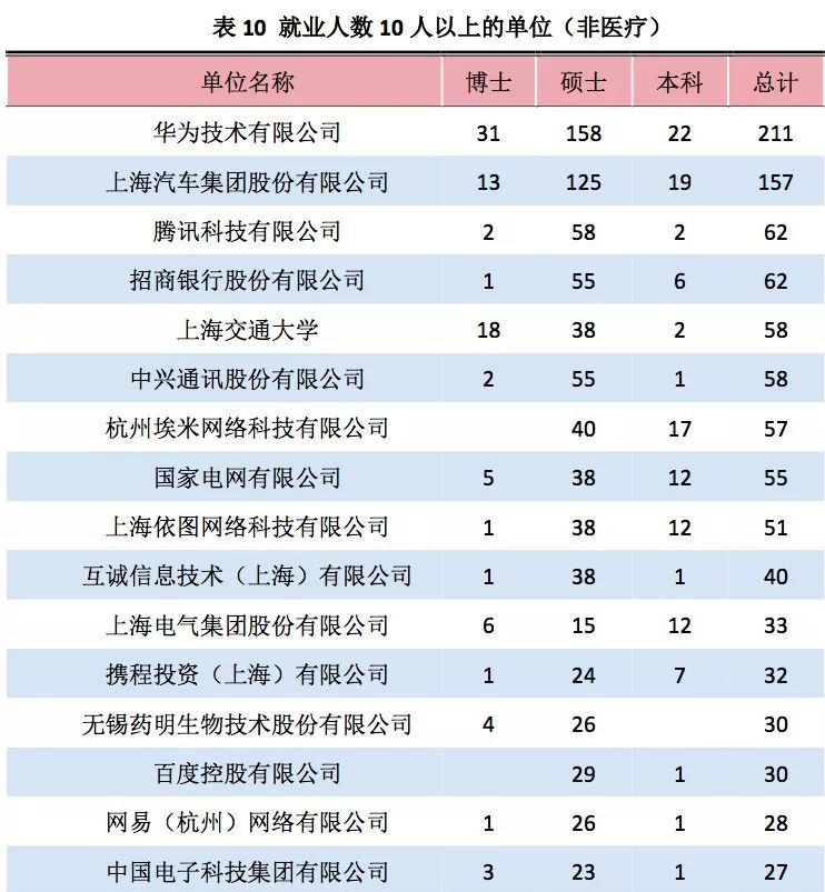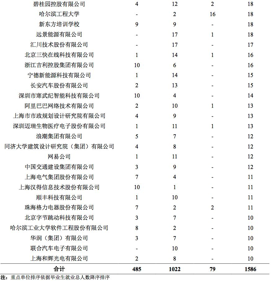 各大高校毕业生中签约较多的单位主要包括各大知名互联网公司、国家重点央企等。今年华为依然成为接受7所C9高校毕业生最多的企业,七所顶尖高校进入华为的毕业生分别有:北京大学(104人)、清华大学(167人)、浙江大学(444人)、上海交通大学(211人)、南京大学(219人)、西安交通大学(315人)和哈尔滨工业大学(269人)。