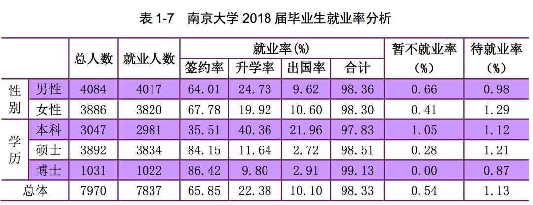 南京大学 2018 届毕业生总体就业率为 98.33%,暂不就业率(拟国内升学、 拟出国等)为 0.54%,待就业率为 1.13%。其中本科毕业生就业率为 97.83%,硕 士毕业生就业率为 98.51%,博士毕业生就业率为 99.13%。(数据截止时间:2018年 11 月 30 日)