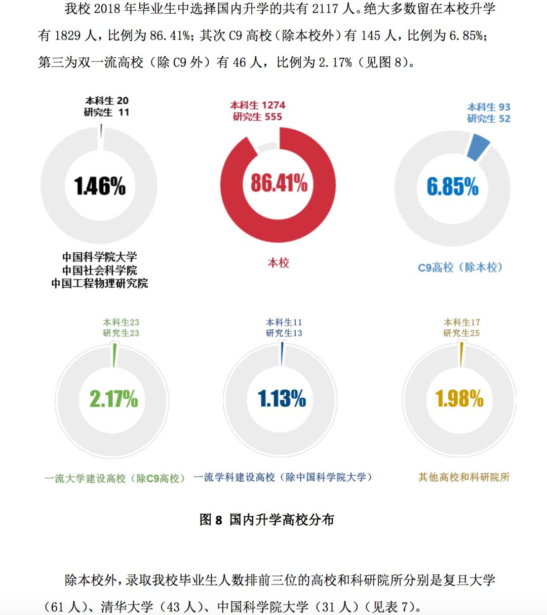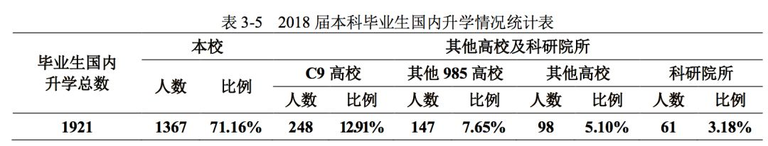 2018 届本科毕业生国内升学 1921 人,占毕业生总数 49.41%,其中 1367 人在本校、248 人 在其他“C9”高校、147 人到其他“985 工程”高校、98 人在其他高校、61 人在科研院所。