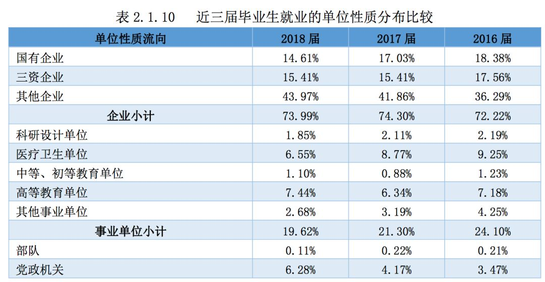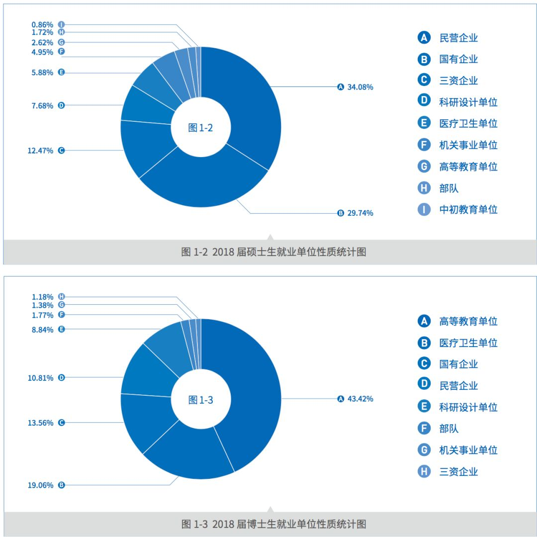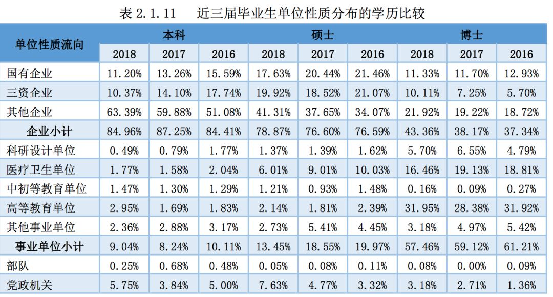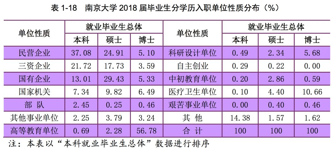 从不同学历毕业生的就业单位性质分布来看,南京大学 2018 届本科毕业生 就业前三类单位分别为民营企业(37.08%)、三资企业(21.72%)、国有企业 (13.01%);硕士毕业生就业前三类单位分别为国有企业(29.43%)、民营企业 (24.91%)、三资企业(17.73%);博士毕业生就业前三类单位分别为高等教育单 位(56.78%)、医疗卫生单位(10.66%)和国家机关(6.49%)。