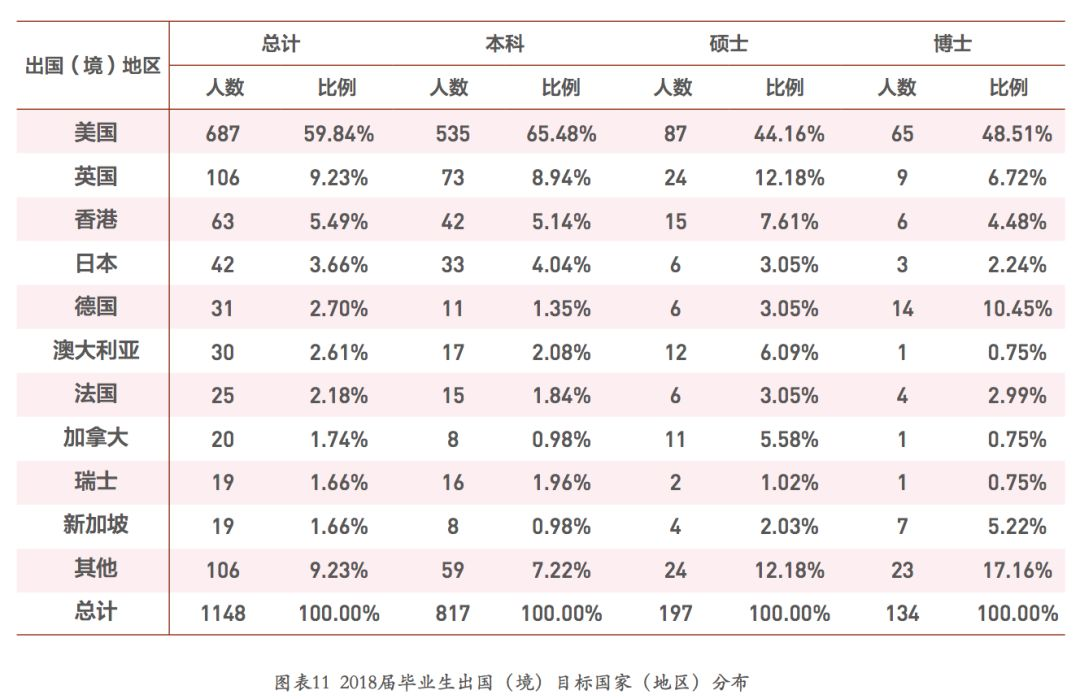 2018年,校本部毕业生出国(境)留学人数为1148人,比例为15.21%,首选目标国家为美国,占出 国(境)留学总人数的59.84%,其次为英国、中国香港,比例分别为9.23%、5.49%,另有部分毕业生选择 到日本、德国、澳大利亚、法国、加拿大、新加坡、瑞士等国家继续深造。