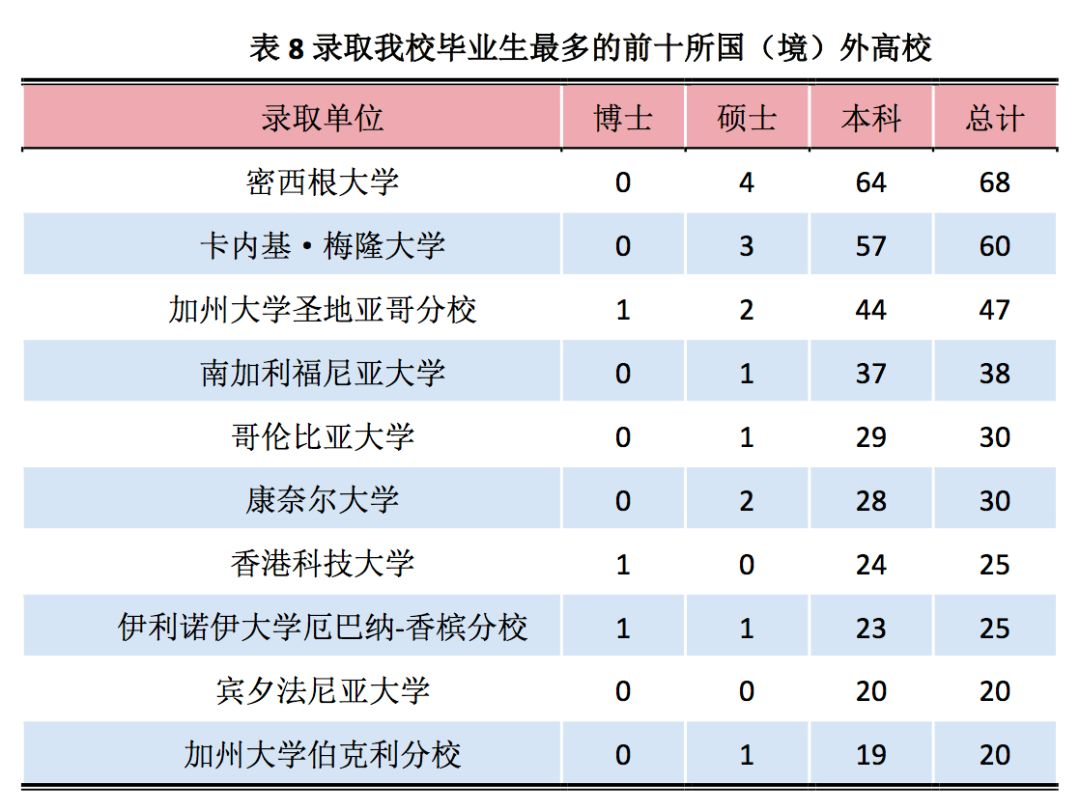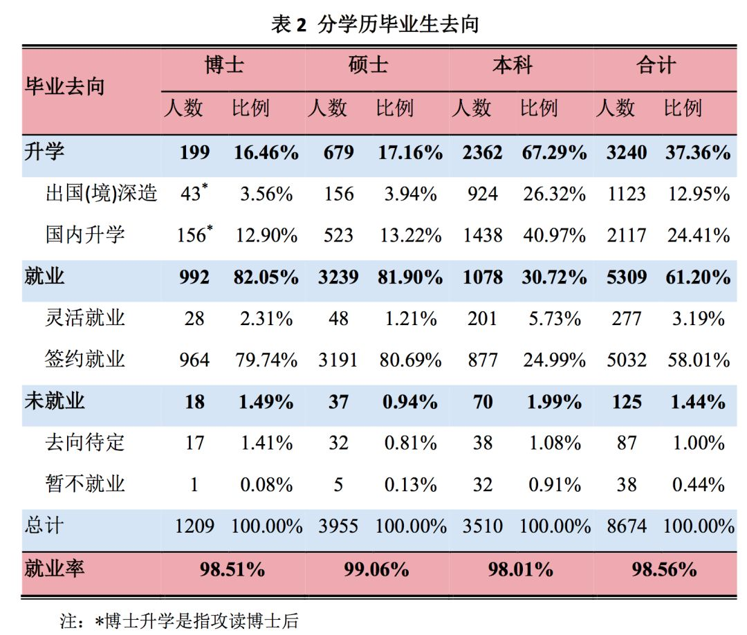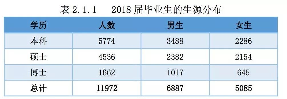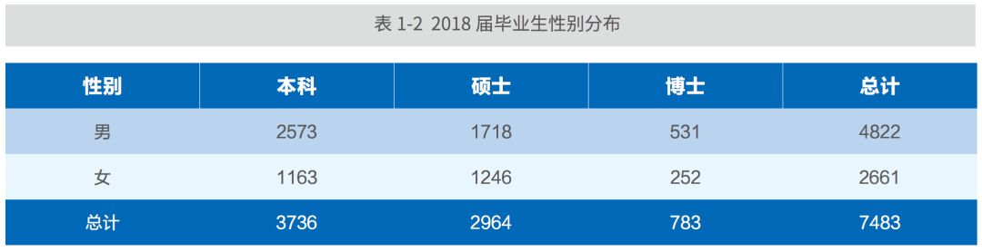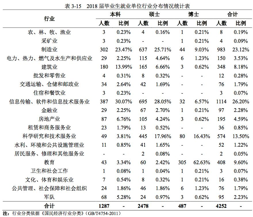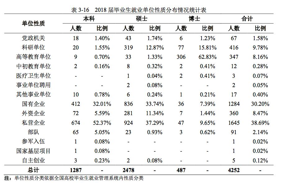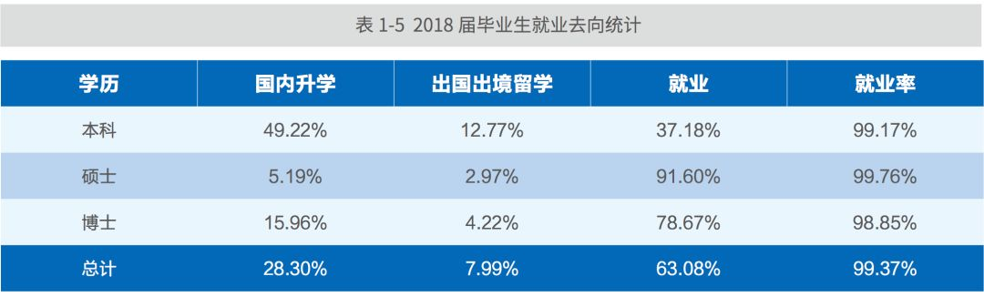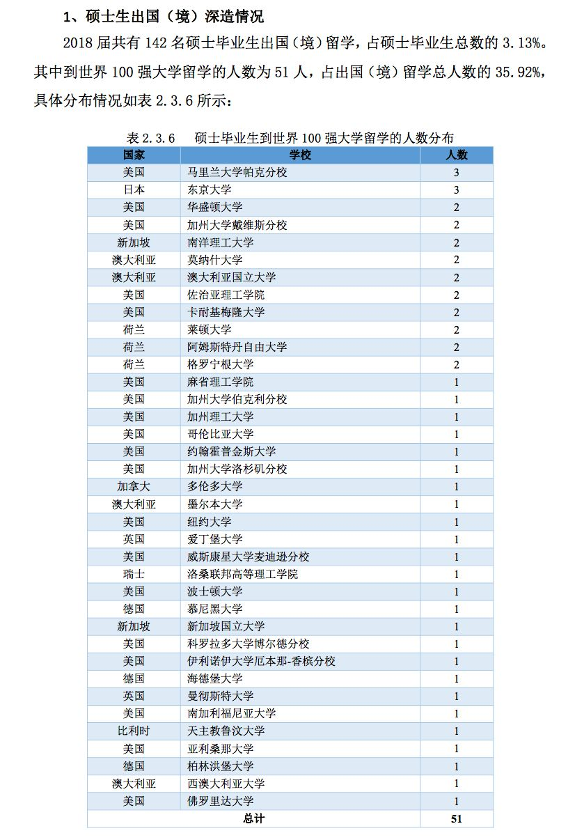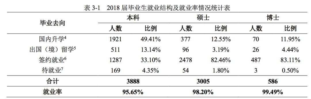 2018 届本科毕业生 3888 人,其中国内升学 1921 人、出国(境)留学 511 人、签约就业1287 人;硕士毕业生 3005 人,其中国内升学 377 人、出国(境)留学为 96 人、签约就业 2478人;博士毕业生 586 人,其中国内升学 70 人、出国(境)留学 26 人、签约就业 487 人。