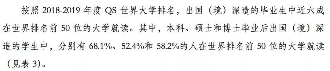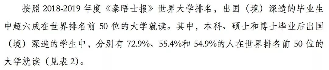 根据2018-2019年《泰晤士报》世界大学排名,我校2018届毕业生中共有668人赴世界排名前50名的国 (境)外高校留学深造,占出国(境)总人数的58.19%。其中出国(境)的本科毕业生有65.61%在排名前 50名的高校就读。