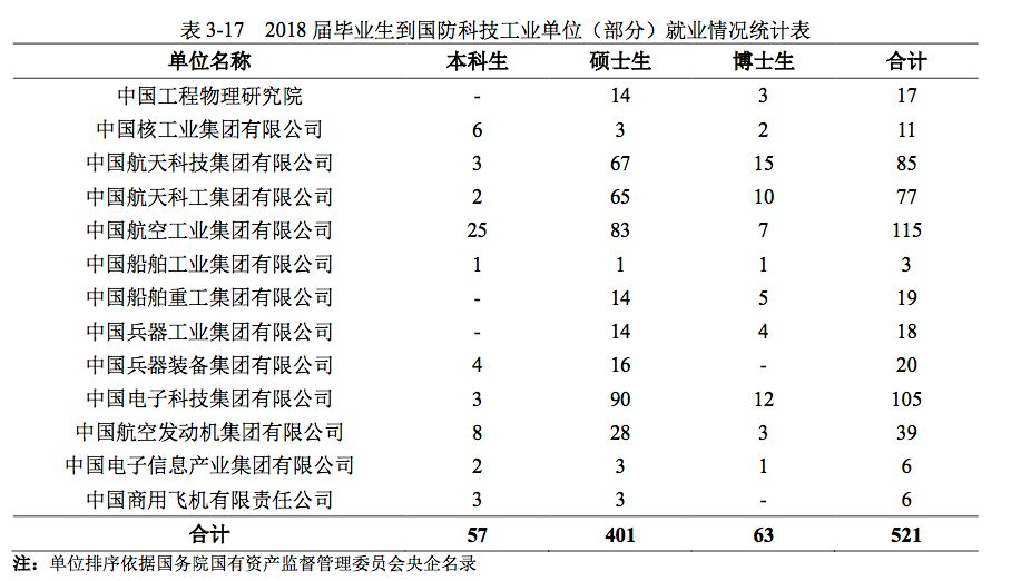 保障国防人才输送是我校就业工作的重要内容。2018 届毕业生签约国防系统就业共计1274 人,占签约就业毕业生总人数的 29.96%,其中签约国防科技工业单位就业毕业生 1183 人, 签约部队就业毕业生 91 人。签约就业超过 50人的国防科技工业单位有 4 个,分别中国航空工 业集团有限公司 115 人、中国电子科技集团有限公司 105 人、中国航天科技集团有限公司 85人、中国航天科工集团有限公司 77 人。