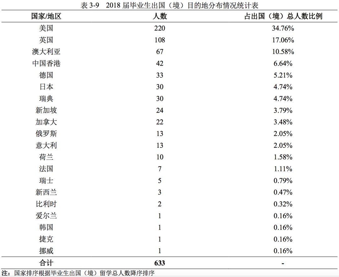 2018 届毕业生中出国(境)留学 633 人,占毕业生总数的 8.46%。出国(境)目的地毕业 生人数最多的为美国(220 人、比例 34.76%);人数 10 人以上的有 11 个 。