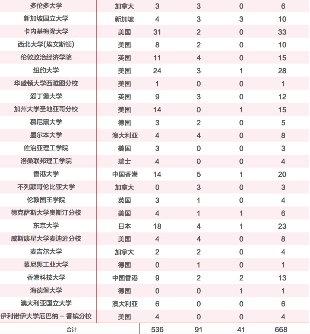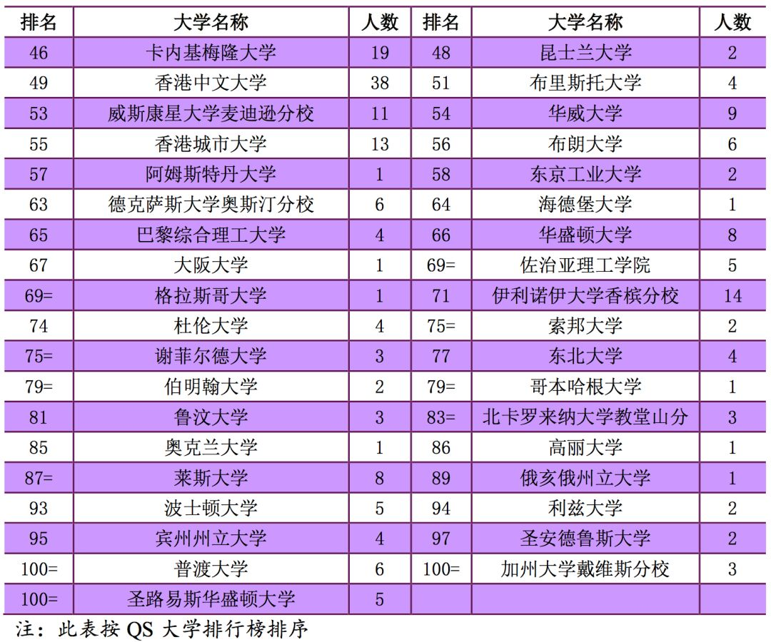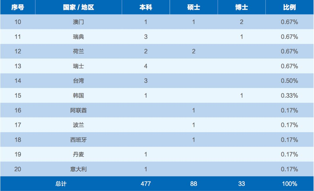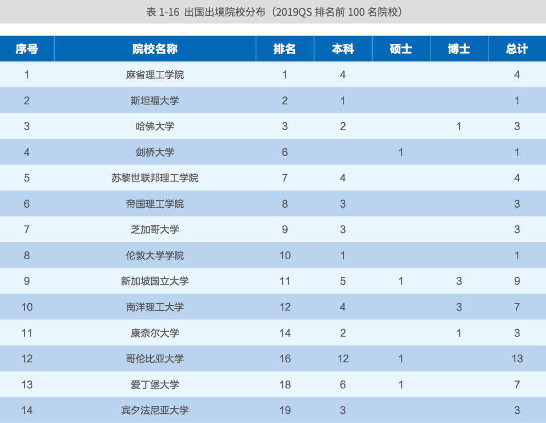 出国出境的毕业生598 人,分布在全球20个国家和地区。其中,到QS 排名前 100 名院校深造的毕业生共有358人,占出国出境人数的 59.87%,高于去年 1.03% 。到 QS 排名前 200 名院校深造的毕业生有 433人,占出国出境人数的 72.41%。