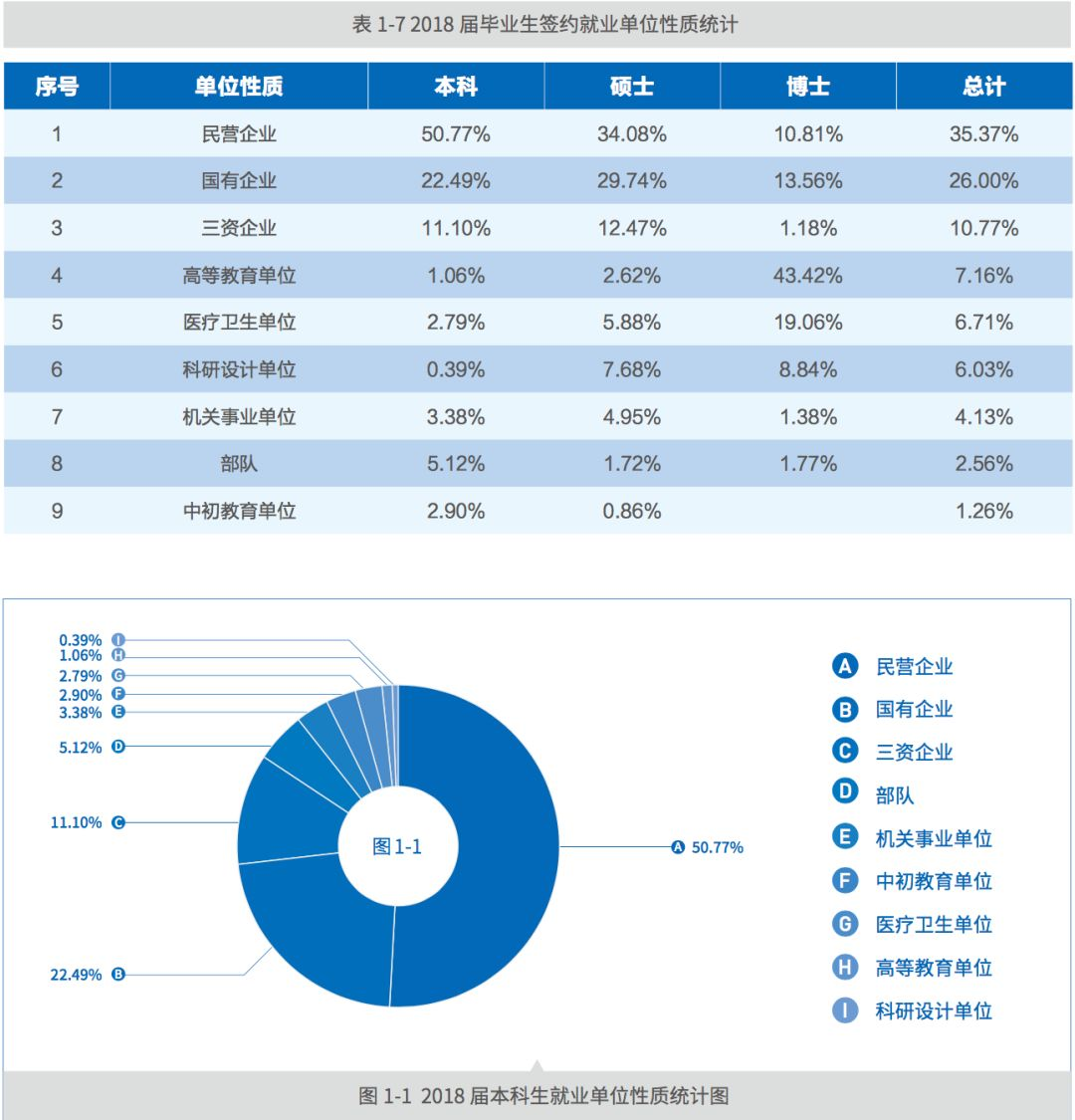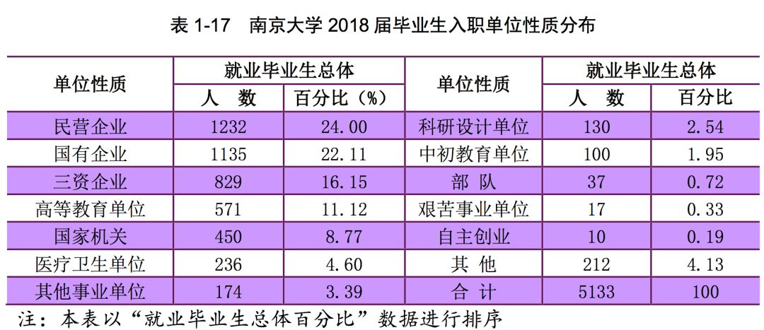 从毕业生入职单位性质分布来看,南京大学 2018 届毕业生就业前三类单位 分别为民营企业 1232 人(24.00%)、国有企业 1135 人(22.11%)和三资企业 829人(16.15%)。