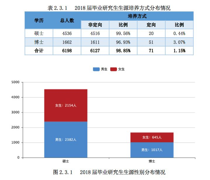 截至 2018 年 11 月 30 日,2018 届毕业研究生共 6198 人(硕士 4536 人、博 士 1662 人),其中男生为 3399 人,占 54.84%,女生为 2799 人,占 45.16%。