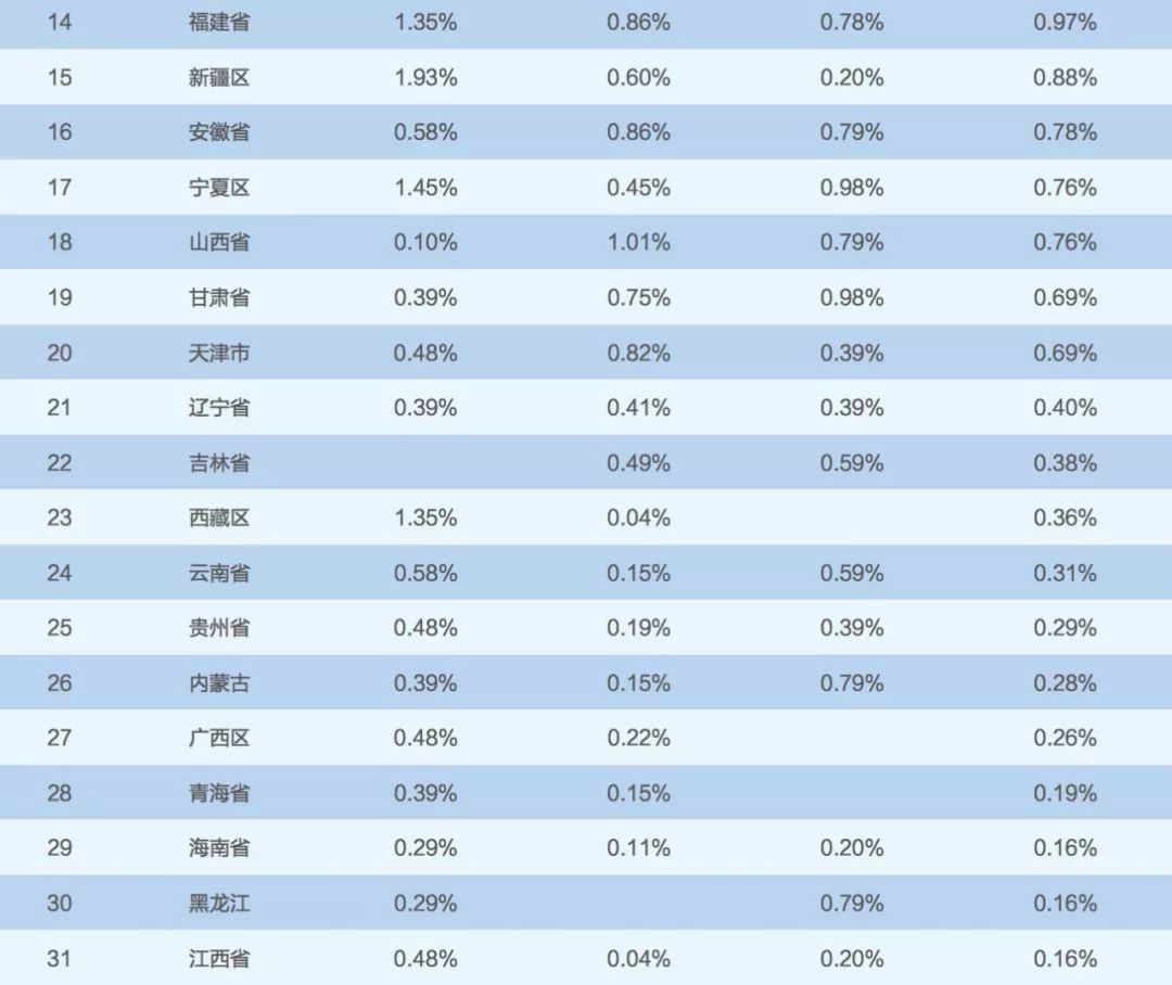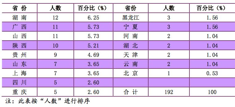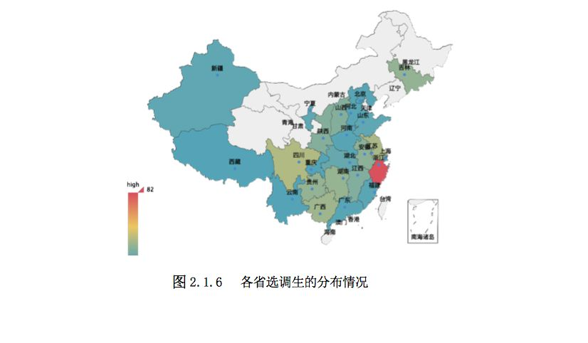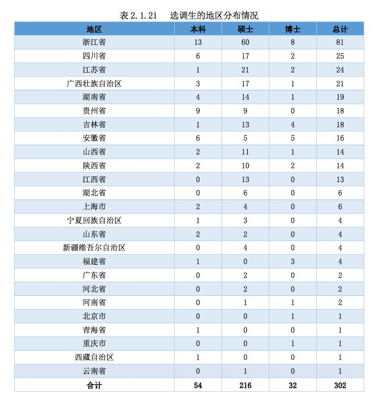 2018 届毕业生中有 302 人进入选调生队伍,各省市、自治区的具体人数分布如 图 2.1.6 和表 2.1.21 所示: