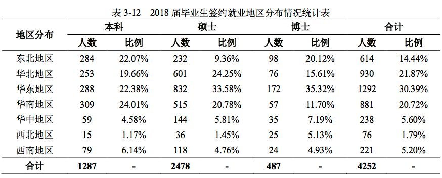 按照地区分布情况统计,2018 届签约就业的毕业生主要分布在华东、华北、华南和东北地 区,共计 3717 人,占签约就业毕业总数的 87.42%。本科毕业生分布在华南、华东、东北和华 北地区的有 1134 人,占签约就业本科毕业生总数的 88.34%;硕士毕业生分布在华东、华北和 华南地区的有 1948 人,占签约就业硕士毕业生总数的 78.61%;博士毕业生分布在华东、东北、 华北和华南地区的有 403 人,占签约就业博士毕业生总数的 82.75%。