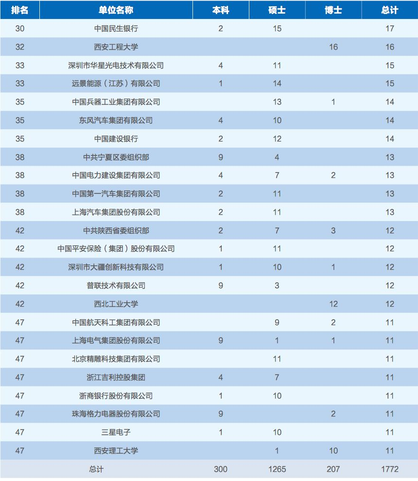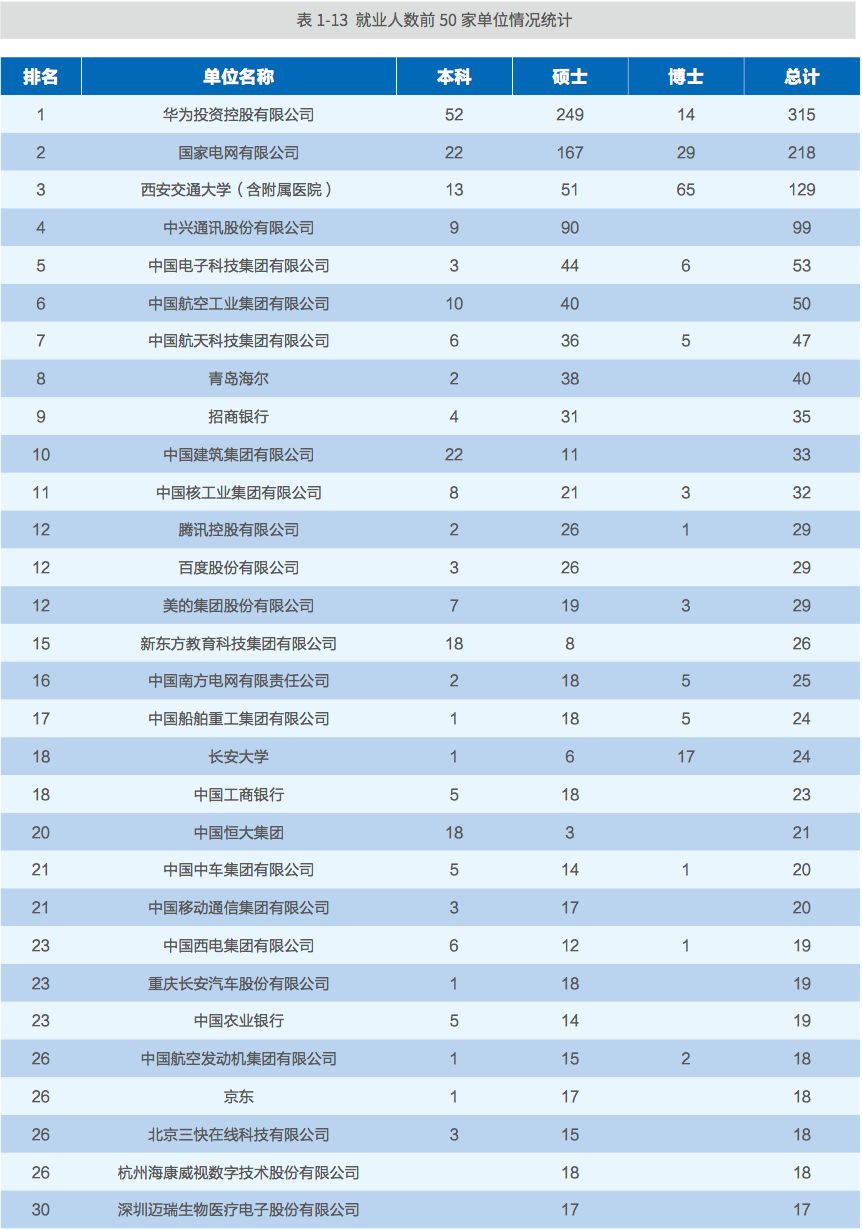 毕业生就业人数前 50 家单位情况:2018 年我校就业人数排名前 50 家单位共招收毕业生 1772 人,占签约就业人数的 42.04%。其中本科生 300 人、硕士生 1265 人、 博士生 207 人。