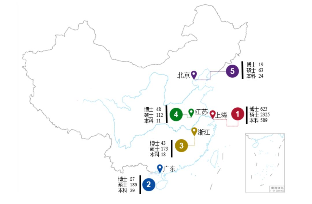从就业地域来看,我校毕业生主要就业省市为上海市。博士生、硕士生和本科生就业人数分别为 623 人、2325 人和 589 人。除上海市外,我校毕业生就业人数较多的省市依次有:广东省、浙江省、江苏省和北京市(图 5)。我校毕业生总体更倾向于在东部地区就业,详细就业单位地区分布见图 6。