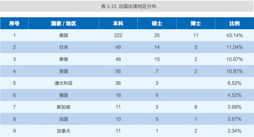 63.58%的毕业生选择美国高校,数量上远超过其他国家和地区。其 他出国(境)深造目的地国家和地区依次为:英国(81 人)、中国香港(70 人)、 澳大利亚(42 人)、日本(42 人)等。