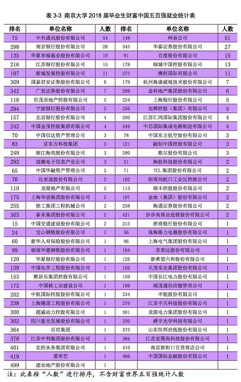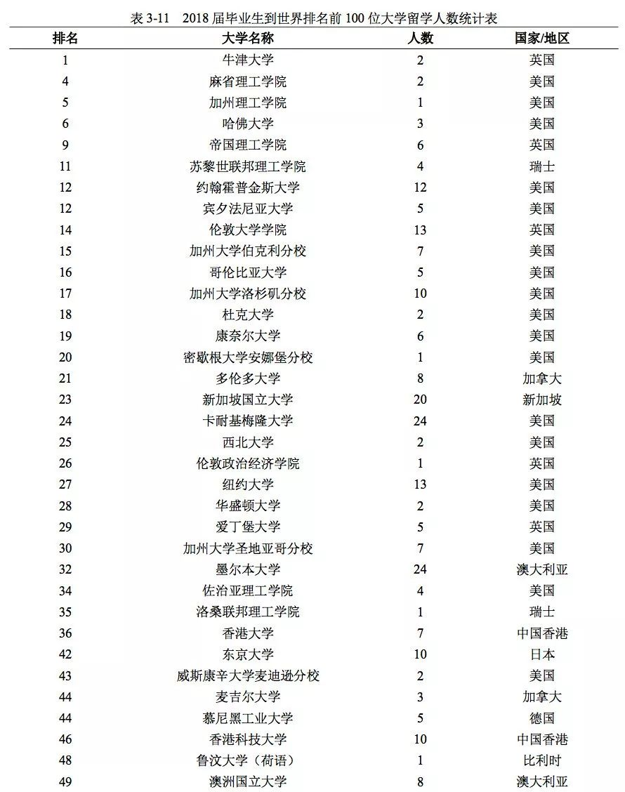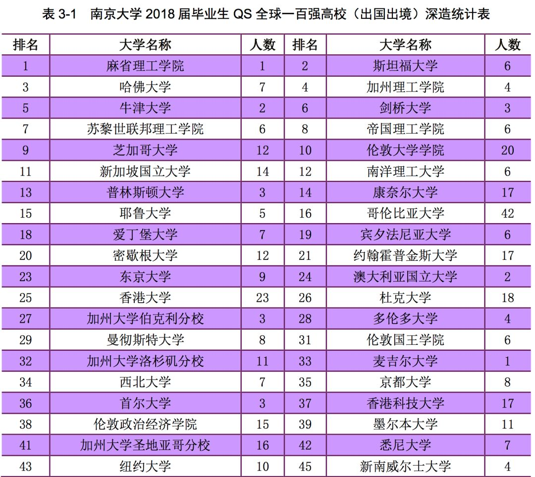 南京大学 2018 届毕业生中 QS 世界大学排名(2019)前 100 名高校(不含 大陆高校)深造的人数为 584 人,占所有出国出境毕业生的 72.64%;QS 世界大 学排名(2019)前 50 名高校(不含大陆高校)深造的人数为 438 人,占所有出 国出境毕业生的 54.48%。
