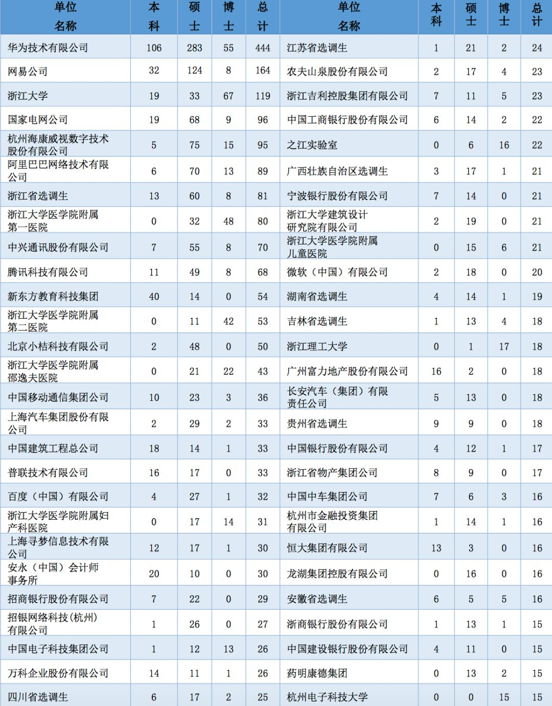 共有 54 家单位录用浙江大学 2018 届毕业生在 15 人及以上,这些单位共接收 毕业生 2398 人,占实际就业人数的 33.34%。