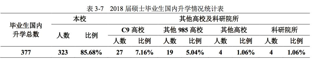 2018 届硕士毕业生中国内升学 377 人,占硕士毕业生总数 12.55%,其中 323 人到本校、27 人到其他“C9”高校、19 人到其他“985 工程”高校、4 人到其他高校、4 人到科研院所。