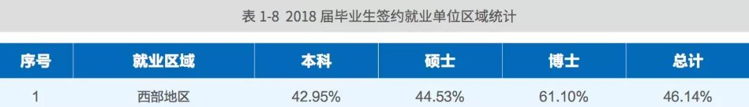 从经济区域分布上,我校 2018 届毕业生到西部就业的人数比例最高,达 46.14%。其中,博士为 61.10%,硕士和本科分别为 44.53% 和 42.95%。
