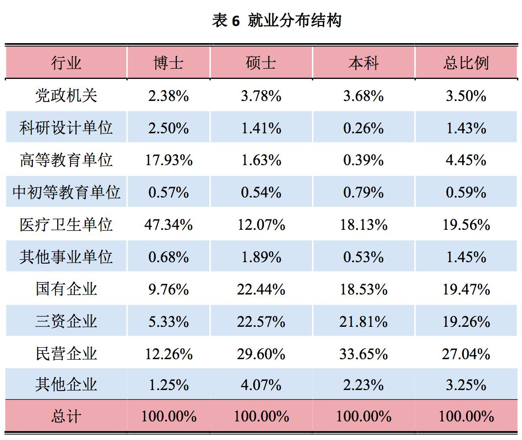 本科和硕士毕业生就业以企业为主,本科生到企业就业的人数达 84.36%;硕士生到企业就业的人数达 76.29%,到科研设计单 位就业人数为 7.68%,到医疗卫生单位就业人数为 5.88%。