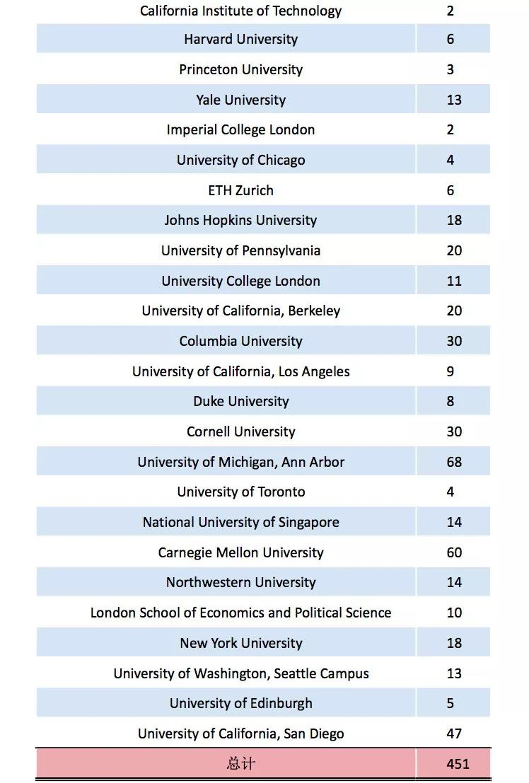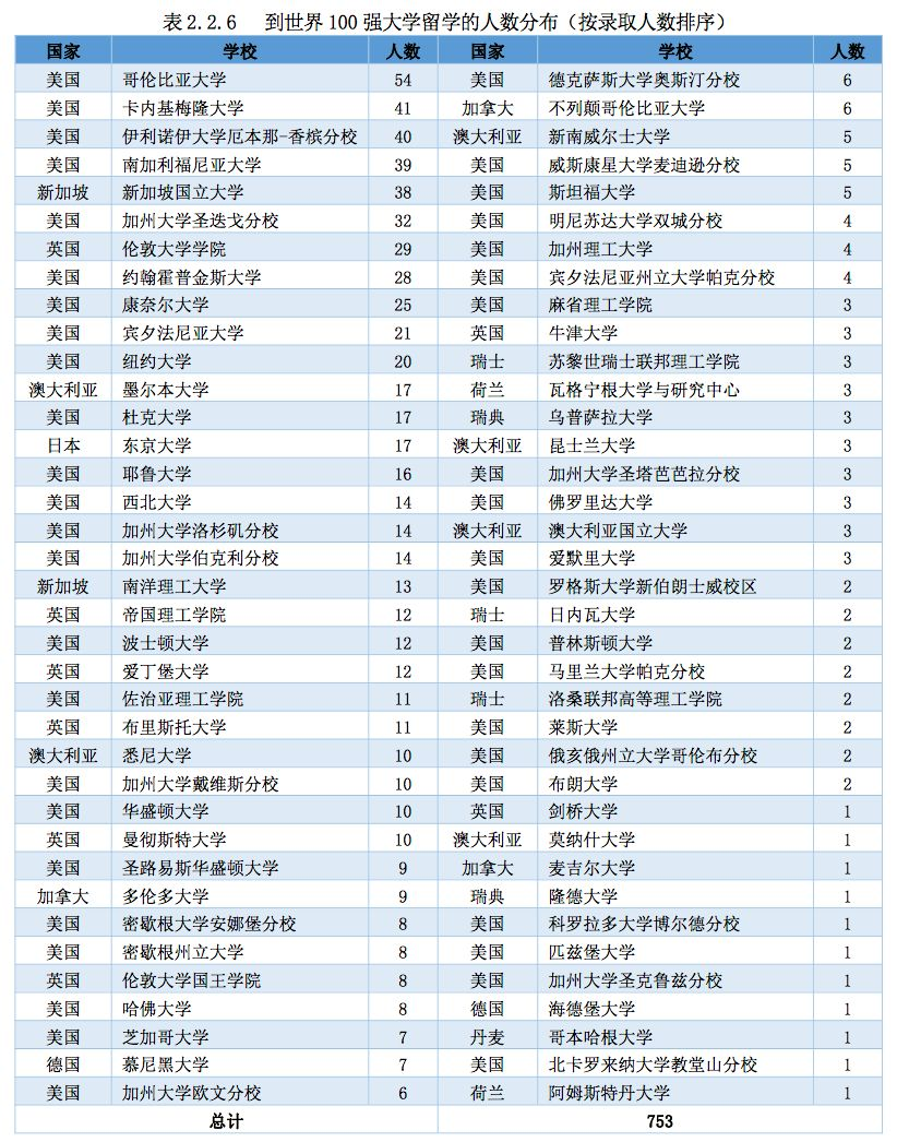本科毕业生赴境外留学的高校层次在一定程度上反映了学校的培养水平和在国际上的知名度。浙江大学 2018 届本科毕业生赴世界 100 强(2018USNews 全球大学排行榜 Top100 院校排名)深造人数为 753 人,占深造总人数的 57.05%。 表 2.2.6 为这些毕业生的具体留学院校及人数分布情况。