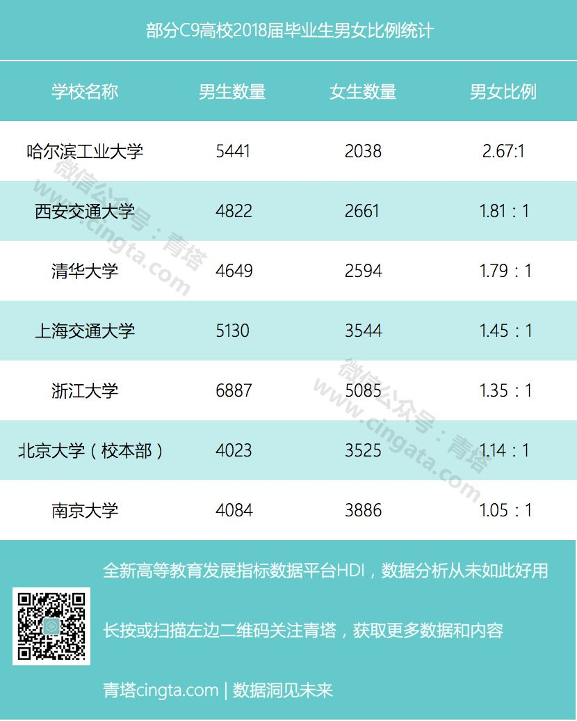 从7所C9高校2018届毕业生的男女比例来看,男生均多余女生。其中哈尔滨工业大学男女比例最高,为2.67:1。西安交通大学和清华大学男女比例约为1.8:1,男生明显多于女生。上海交通大学、浙江大学、北京大学(校本部)和南京大学毕业生中男女比例相对较小,不过男生数量同样多于女生。