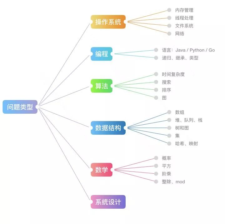 一张互联网公司面试中经常考察的问题类型总结的思维导图,我们可以结合图片中的信息分析一下。