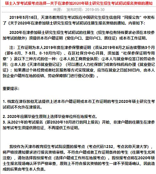 2020年往届生在天津参加研究生考试将受限,重点如下: