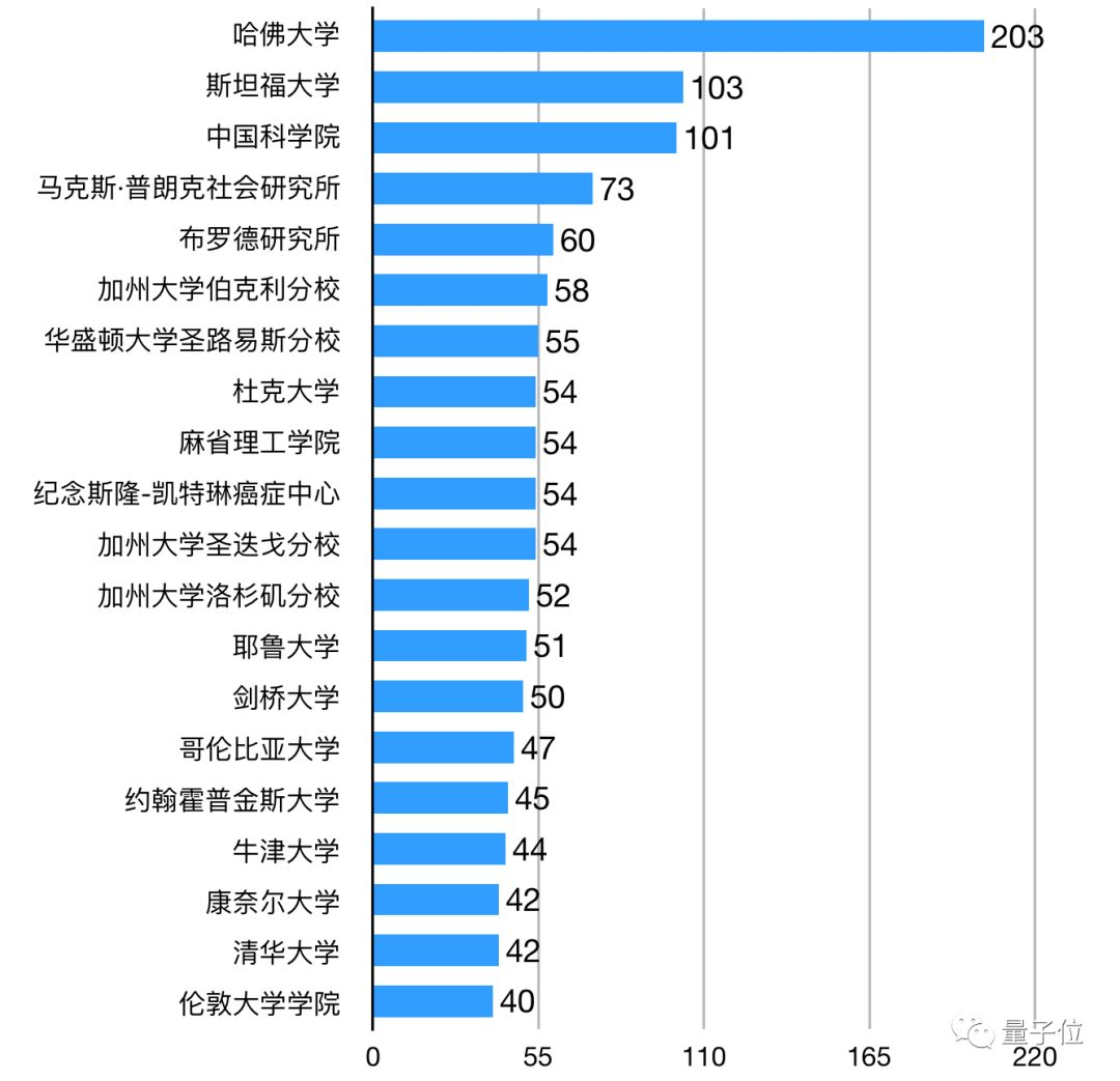 中国方面,中科院之后便是清华大学,42人上榜,在牛津和康奈尔之后,排名全球19。