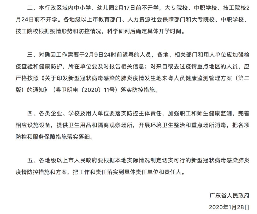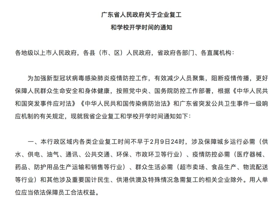 1月28日,广东省政府官方网站发布《广东省人民政府关于企业复工和学校开学时间的通知》,广东省企业复工和学校开学时间正式确定。