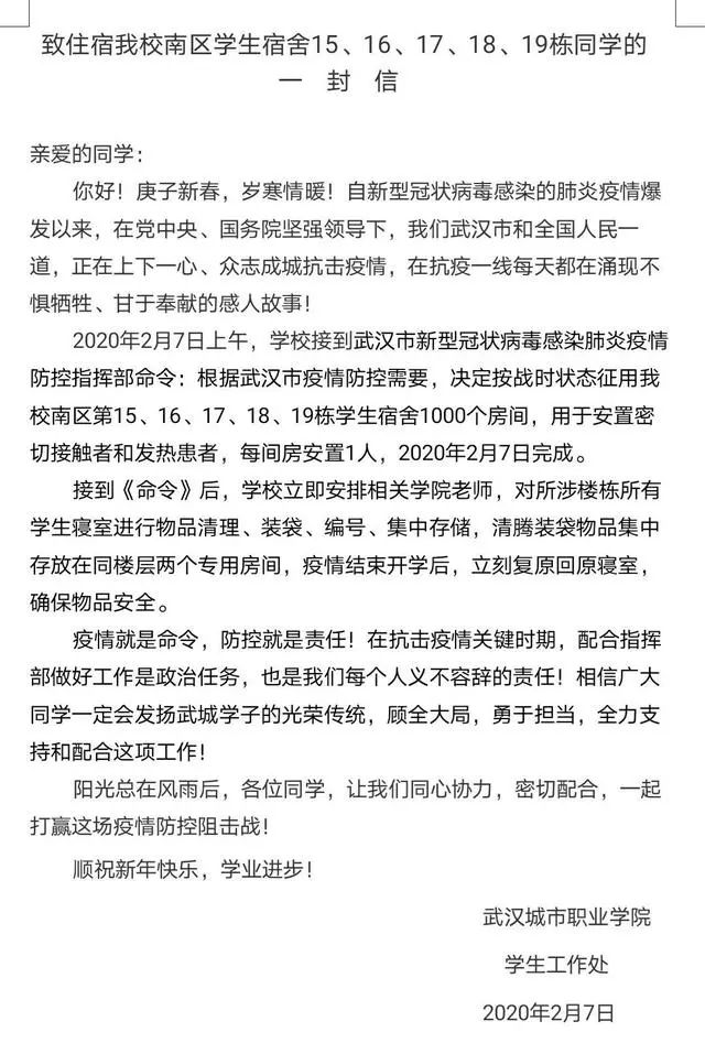 武汉商学院、江汉大学、武汉船舶职业技术学院、武汉软件工程职业学院已发布公告,部分学生宿舍被临时征用,用于武汉市疫情防控工作。