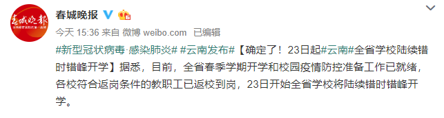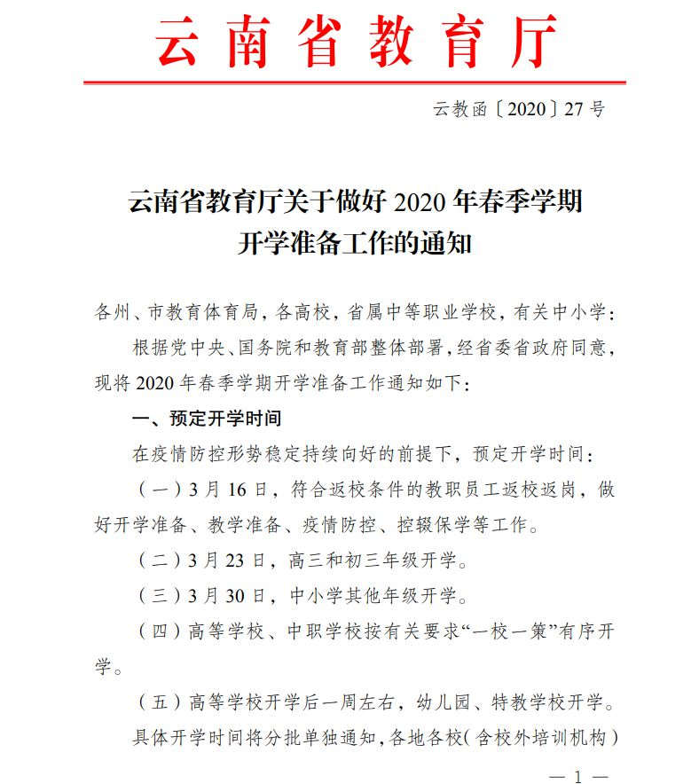 此前,云南省教育厅发布《关于做好2020年春季学期开学准备工作的通知》, 2020年春季学期开学时间敲定。其中提到,高等学校、中职学校按有关要求“一校一策”有序开学,具体开学时间将分批单独通知,各地各校(含校外培训机构)未接到正式开学通知前,不得自行开学。
