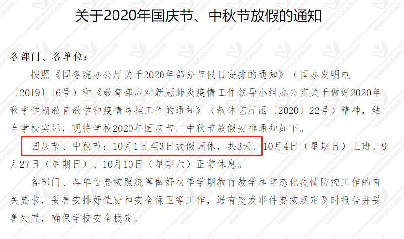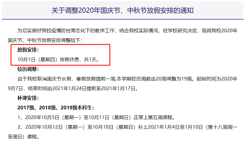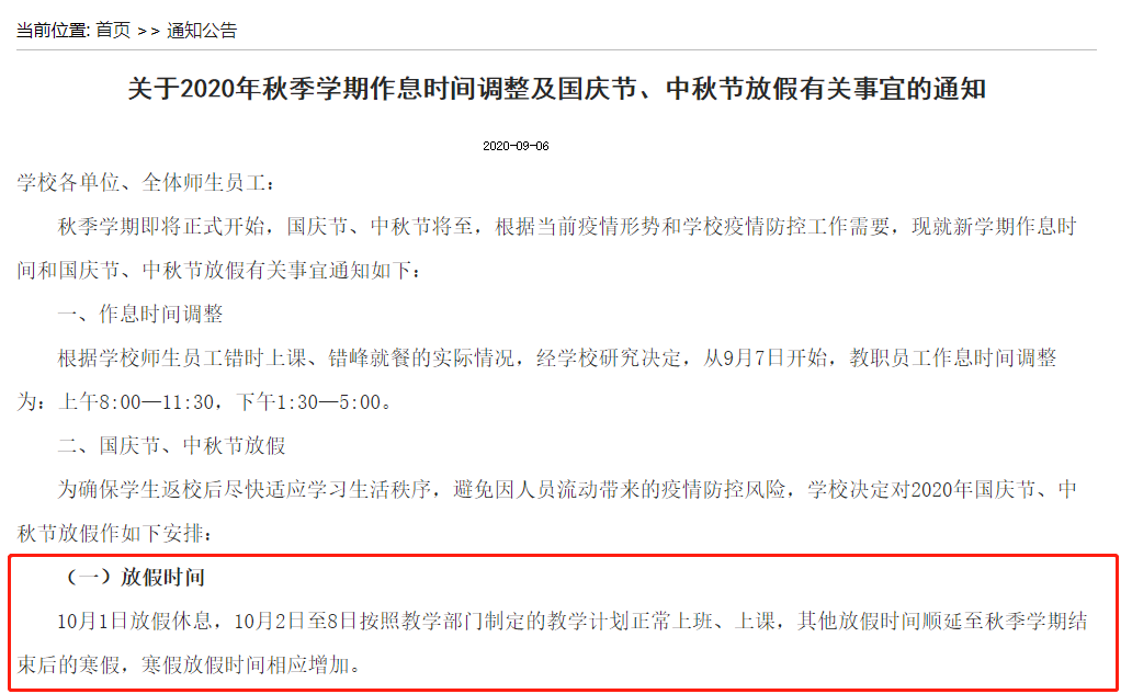 9月6日,长春大学官网“通知公告”栏目发布的《关于2020年秋季学期作息时间调整及国庆节、中秋节放假有关事宜的通知》显示,为确保学生返校后尽快适应学习生活秩序,避免因人员流动带来的疫情防控风险,学校决定对2020年国庆节、中秋节放假安排为: