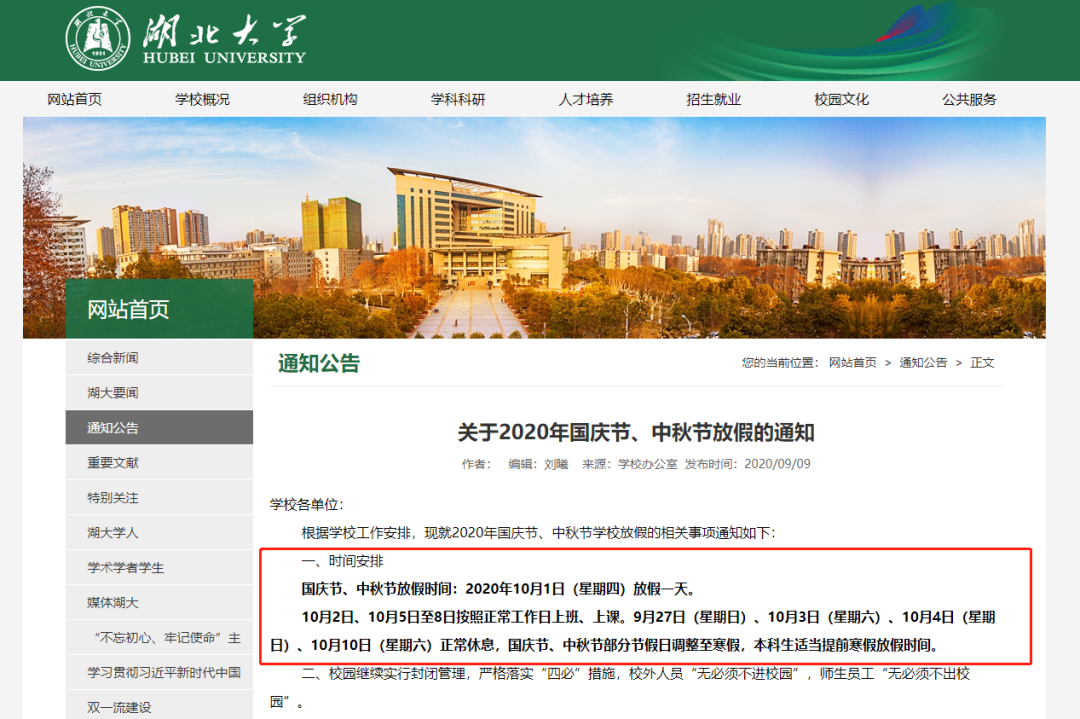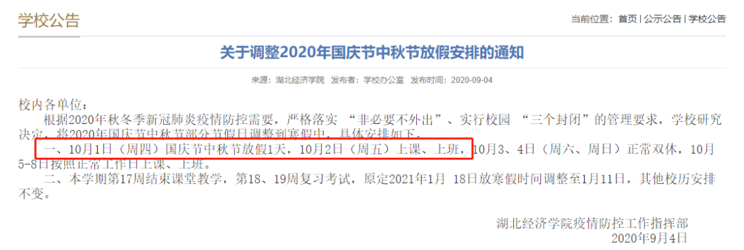 此外,湖北大学、湖北经济学院也对假期安排作出调整,10月1日(周四)放假一天,期间的周一至周五正常上课,周末安排休息。与此同时,寒假也有所提前或延长。