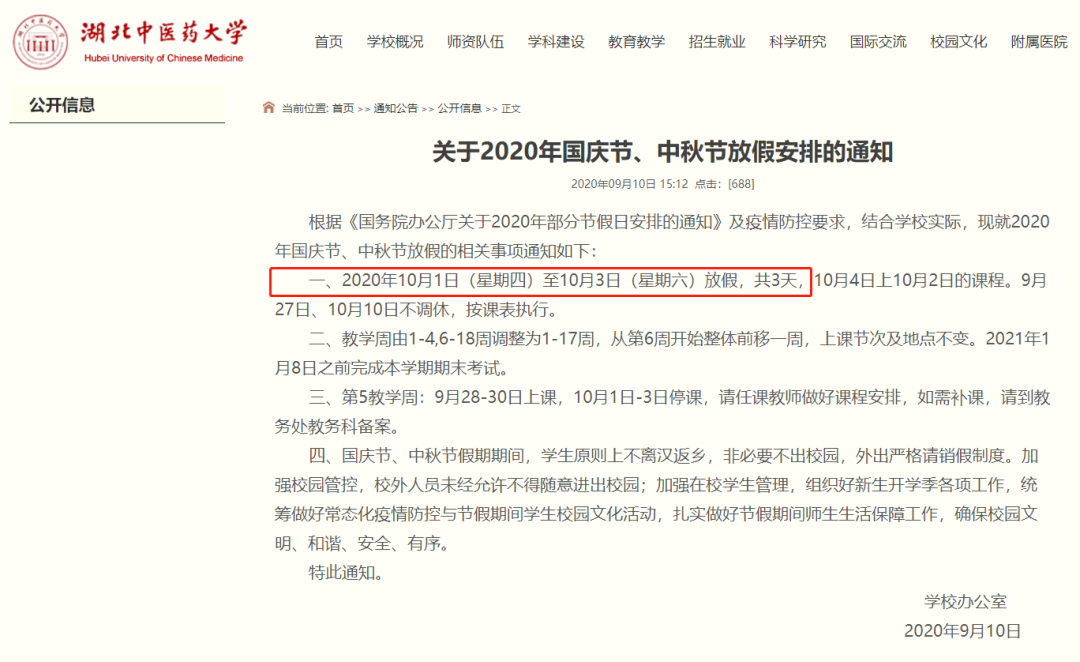 湖北中医药大学:10月1日(星期四)至10月3日(星期六)放假,共3天。